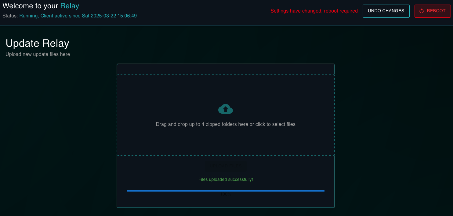 Do NOT use this update method unless the relay is already on APP version 2.0.6 or above, trying will break the relay. See System Update (USB) if on a lower version.