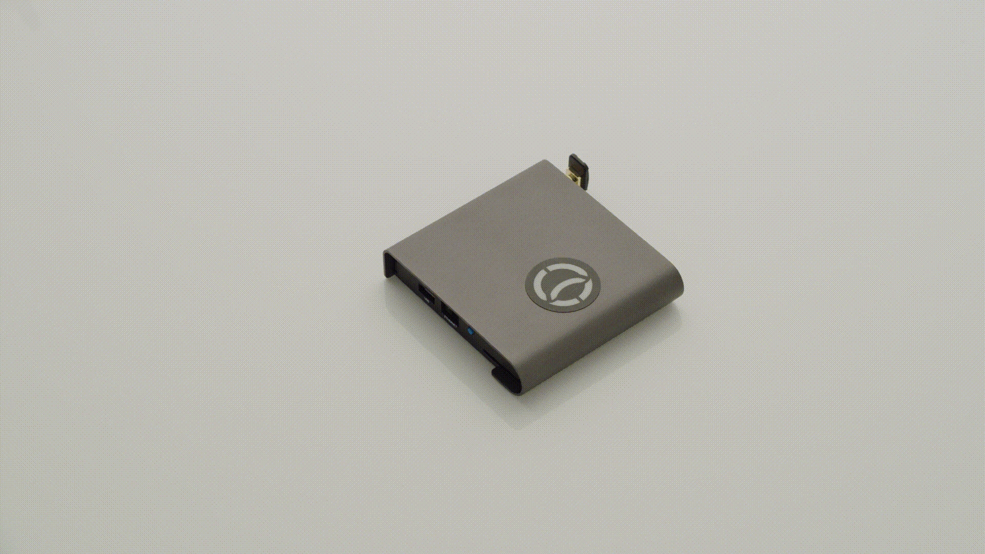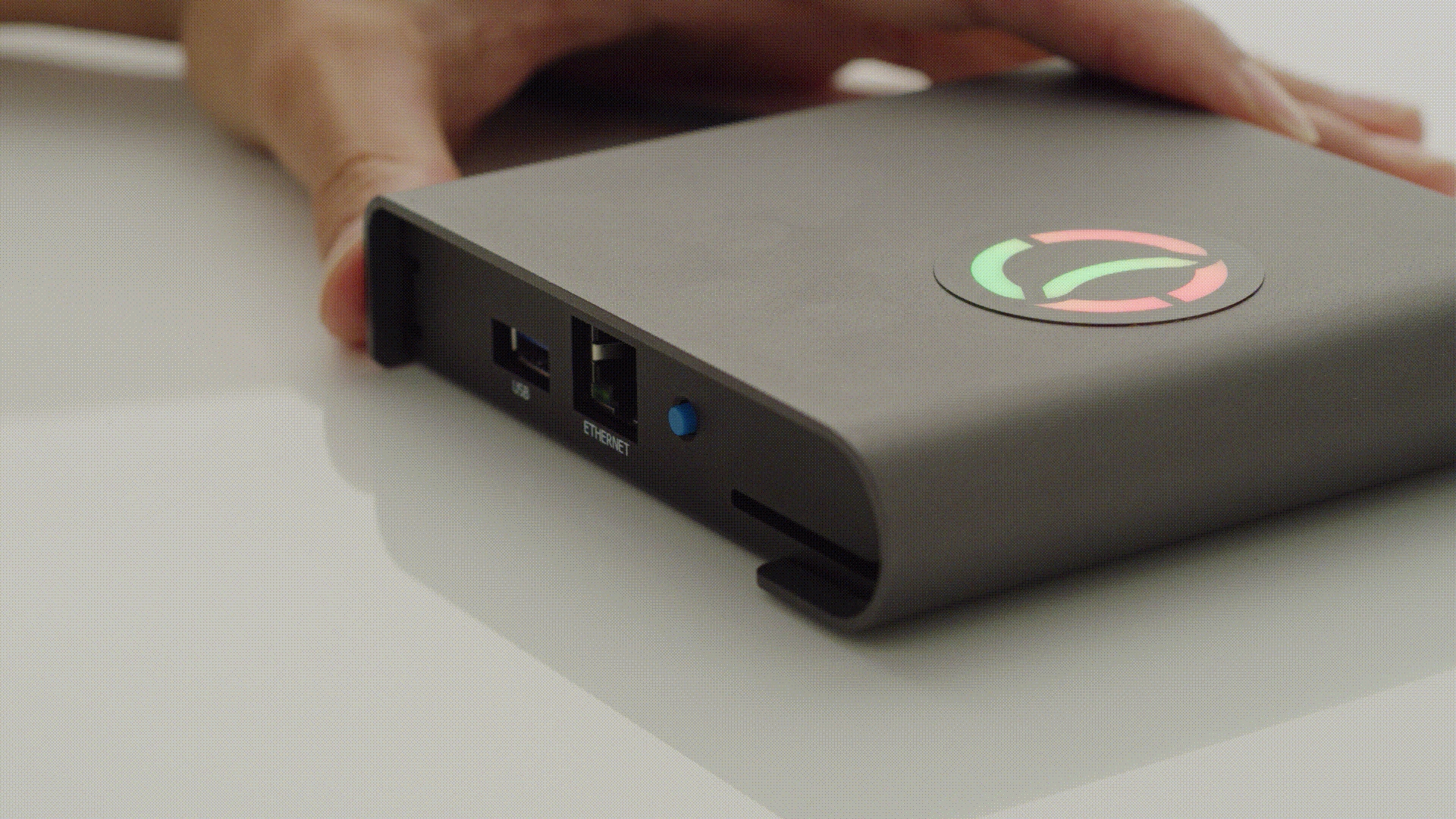 The device is powered by USB-C, which is plugged into the back-left of the unit. Once plugged in, the unit will boot up with green loading lights, and end with all lights red.