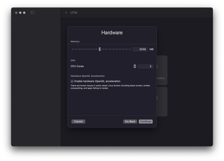 Select the amount of **Memory** and **CPU** cores to allocate to your **Virtual Machine**.&#x20;
