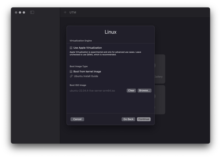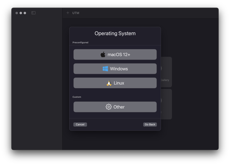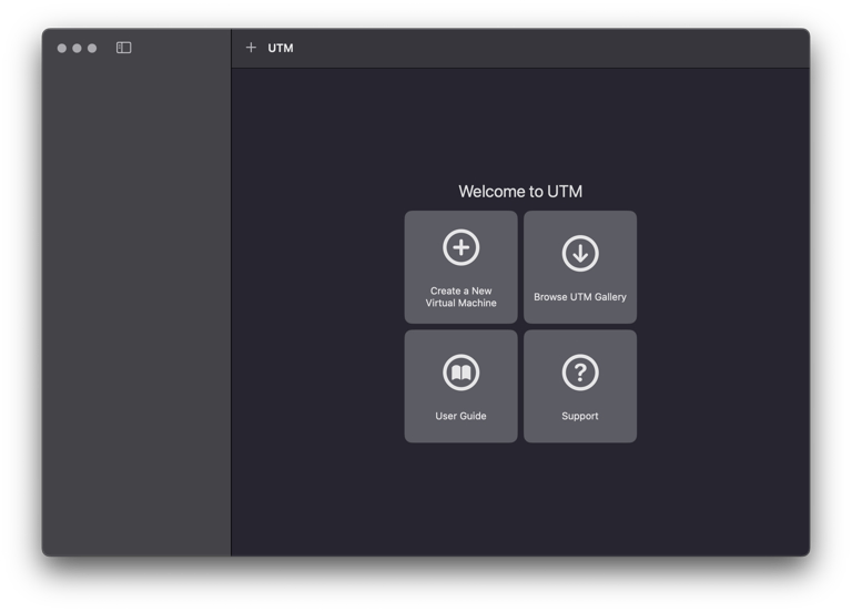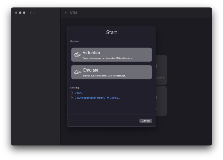 Start the **UTM** application and choose "**Create a New Virtual Machine**", then select "**Virtualize**".