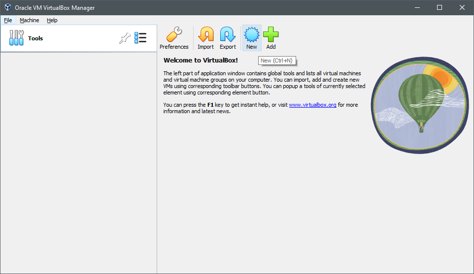 In the VirtualBox Manager window, click on 'New' to initiate the creation of a new virtual machine.