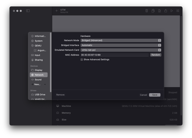 Go to the **Network** section and change the **Network Mode** to **Bridged (Advanced)**, then press **Save**.