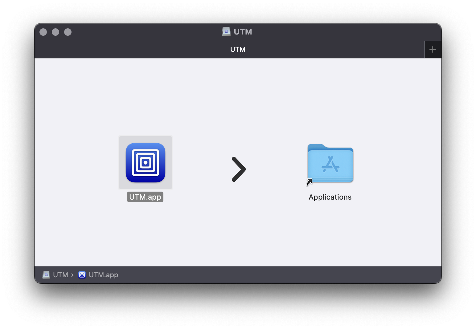 When prompted, drag the **UTM.app** icon to the **Applications** folder to **install UTM**.