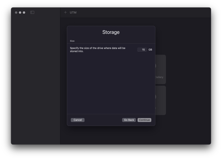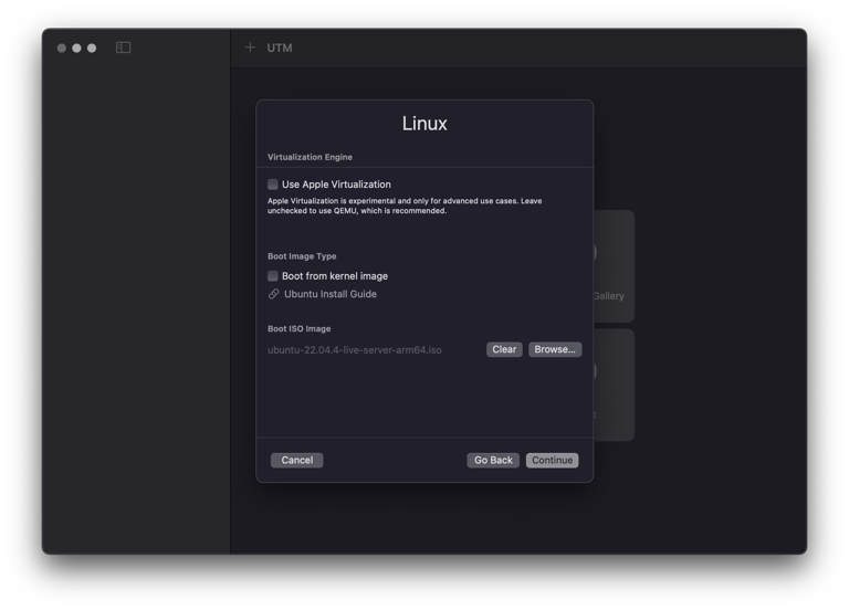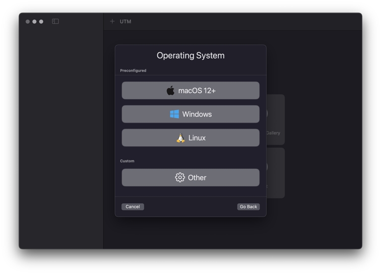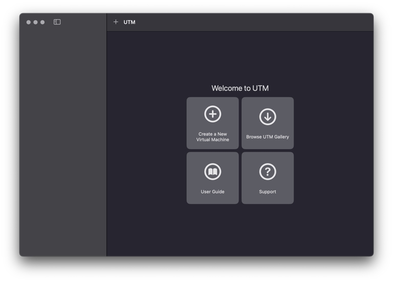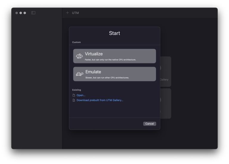 Start the UTM application and choose "Create a New Virtual Machine", then select "Virtualize".