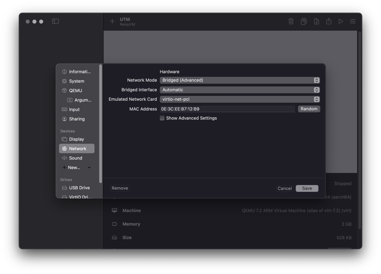 Go to the Network section and change the Network Mode to Bridged (Advanced), then press Save.