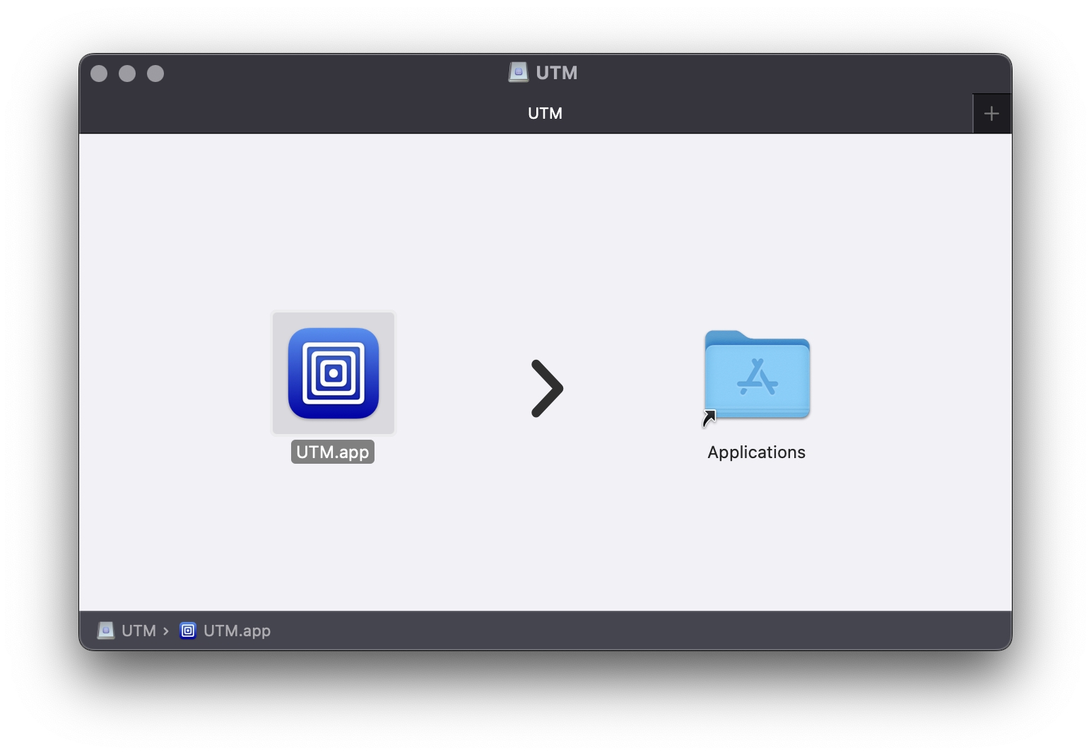 When prompted, drag the UTM.app icon to the Applications folder to install UTM.